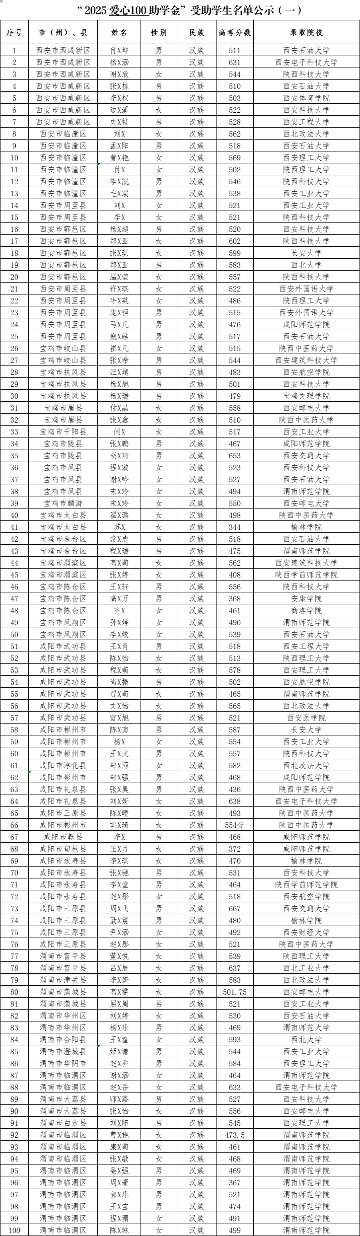“ 2025 爱心100 助学金”受助学生名单公示(一)