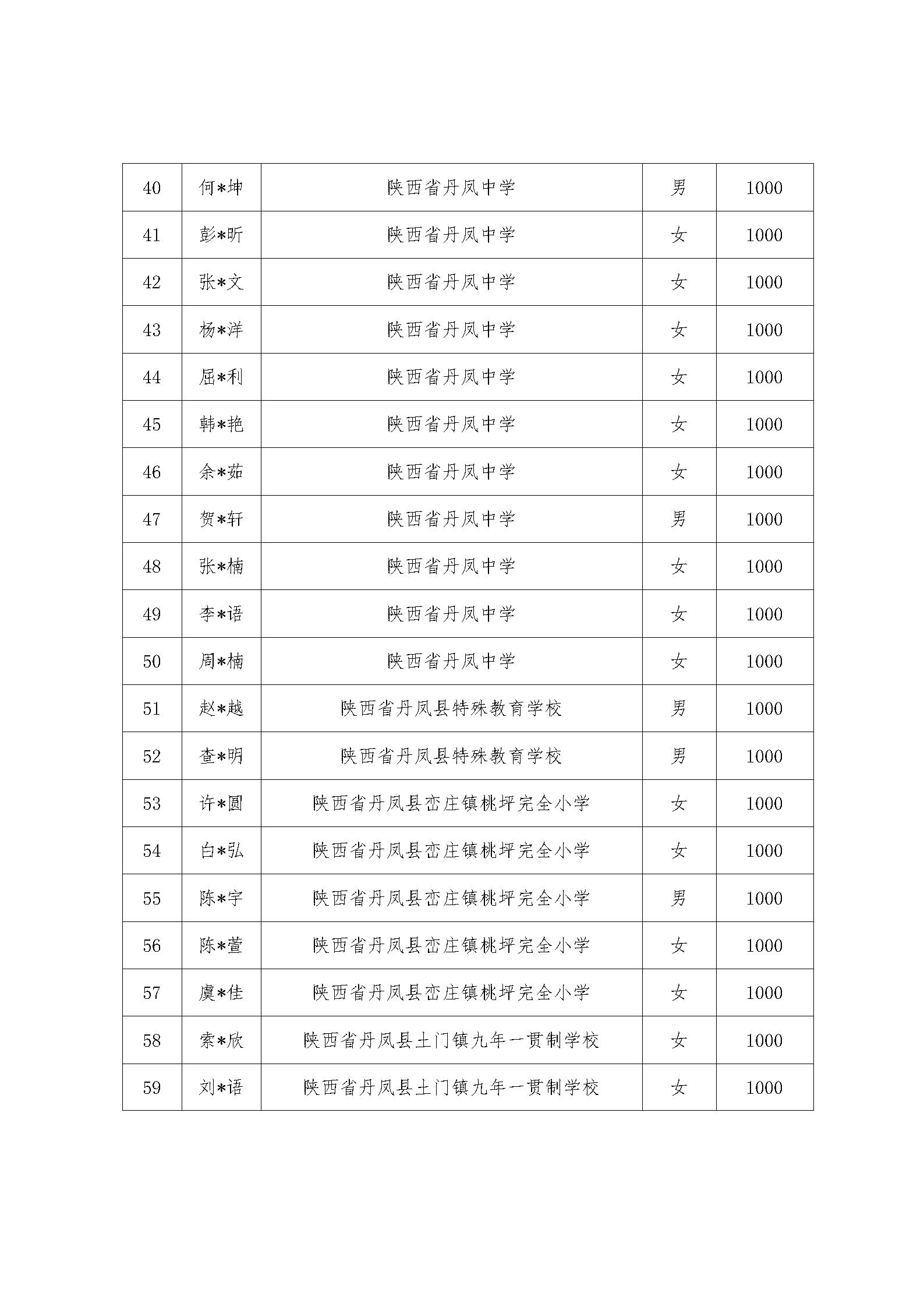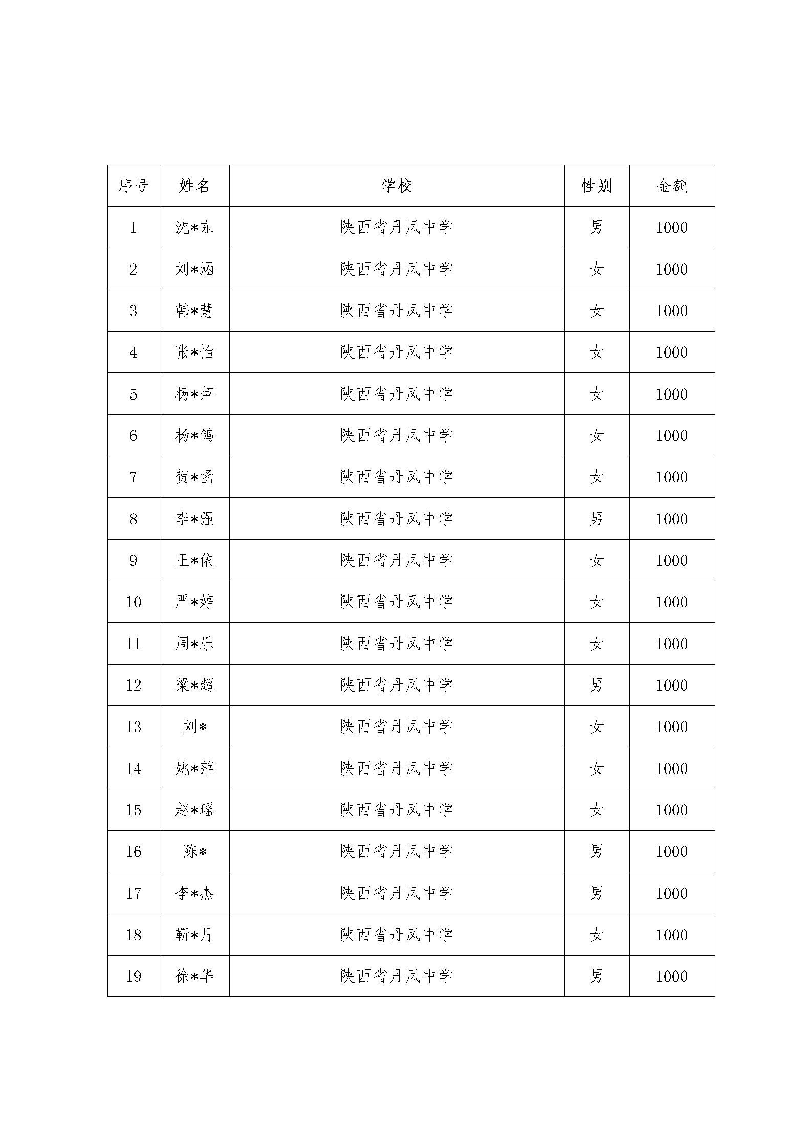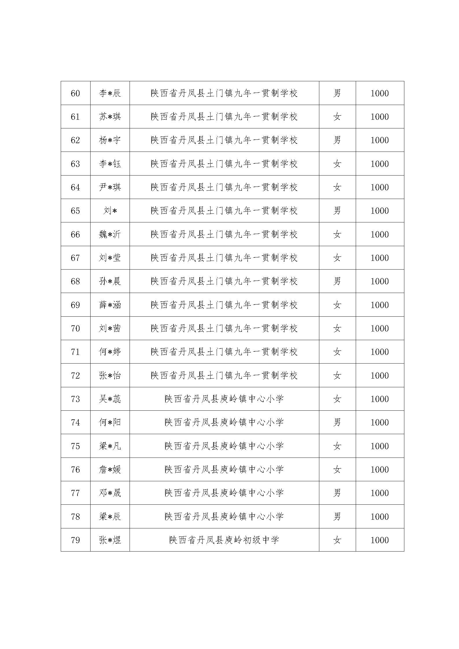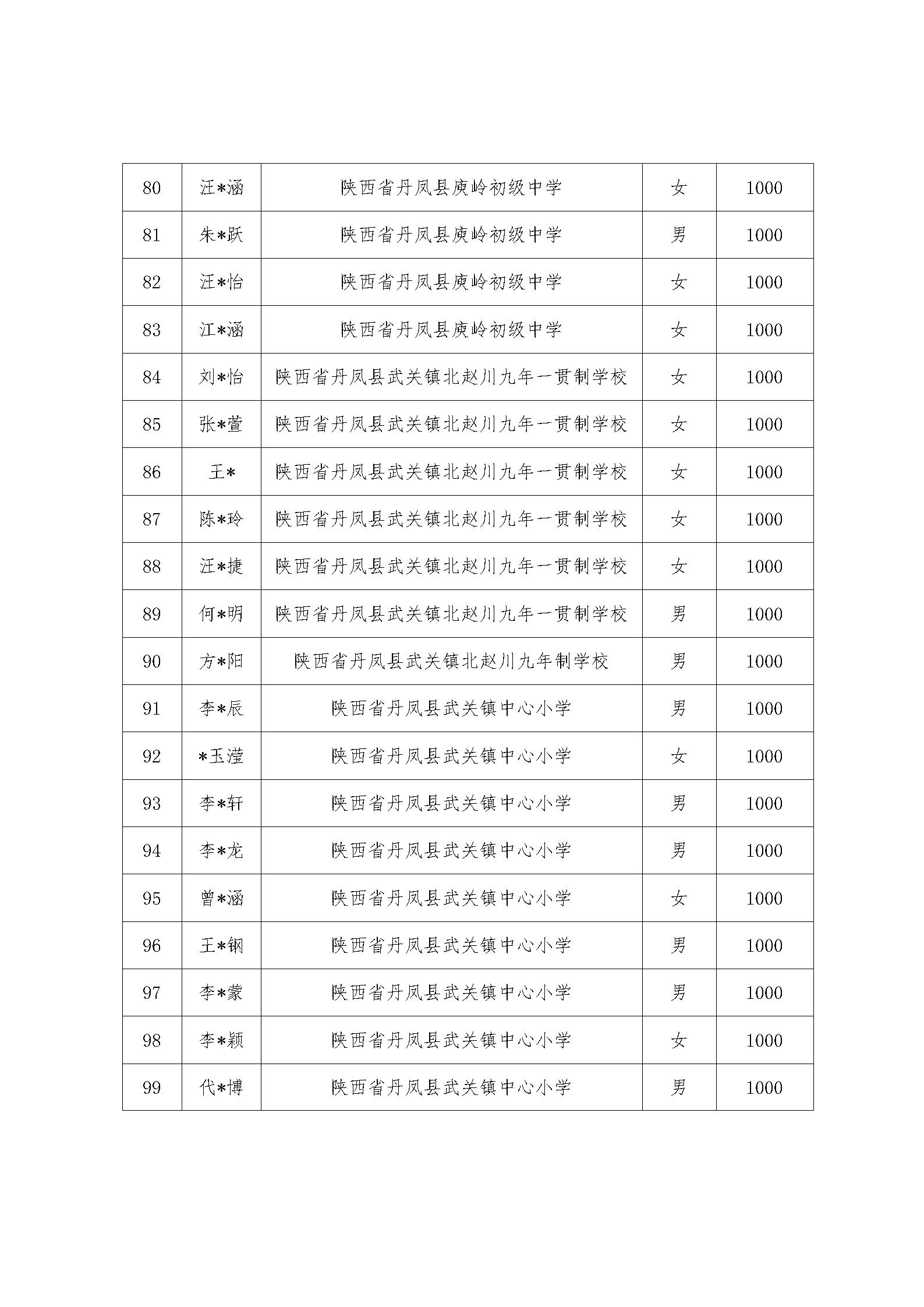 根据“与光丹凤手牵手”受助学生资助标准和推选条件,通过学生本人自愿申请,经相关部门审核,确定100人受助。现将名单公示如下: