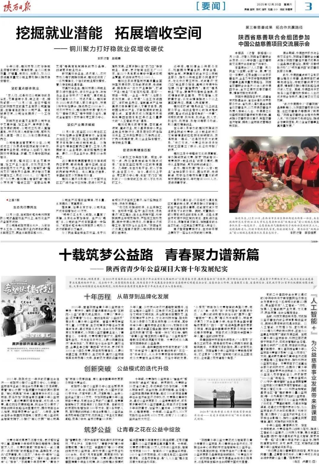 大赛十年成果惠及三秦大地,累计帮扶留守儿童、困境青少年和银发群体等特殊人群超百万人次。大赛构建起“项目孵化—能力建设—资源对接”的完整生态链,品牌裂变,衍生出“逐梦青春,助力三农”、“烛光·云·薪传”公益支教、“新世纪希望故事汇”、“福彩公益,刮刮乐爱‘心’相伴”、“东润青少年足球赛”、“青伴夕阳”智慧助老、“保护母亲河”蚂蚁森林多树种造林、“节水护水 三秦行动”、“青春护航”青少年禁毒戒毒、“情系灾区 希望同行”等10个领域创新标杆公益项目,年均开展公益示范活动300余场。形成“月月有主题、周周有行动”的常态化公益志愿服务机制。大赛从最初聚焦改善困境青少年生长环境,到以创新理念和模式解决困境青少年健康成长共性问题,汇聚慈善力量助力公益慈善事业高质量发展。十年间,大赛累计带动超10万人次参与公益实践,培育优秀项目740个。培育出17个全国金奖项目、140个省级示范项目,成为西北地区公益创新策源地。这些数字背后,是“人人公益”理念在三秦大地的生动实践。